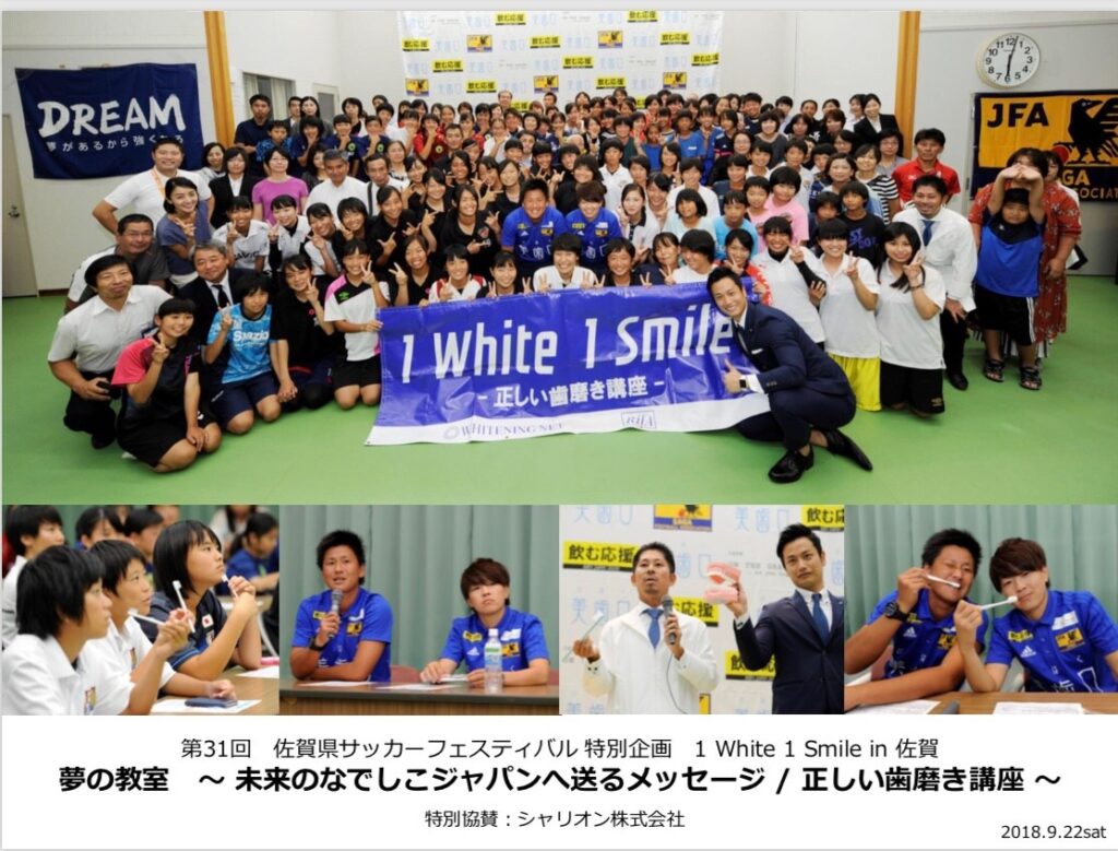 株式会社シャリオン(本社:東京都港区、代表取締役社長:角田哲平)は、 CSV活動の一環として、去る9月22日(土)佐賀総合運動場にて、 地元サッカーチームに所属する子供たちに、 全国の歯科医師と歯磨き教室『1White 1Smile』を開催させて頂きました。