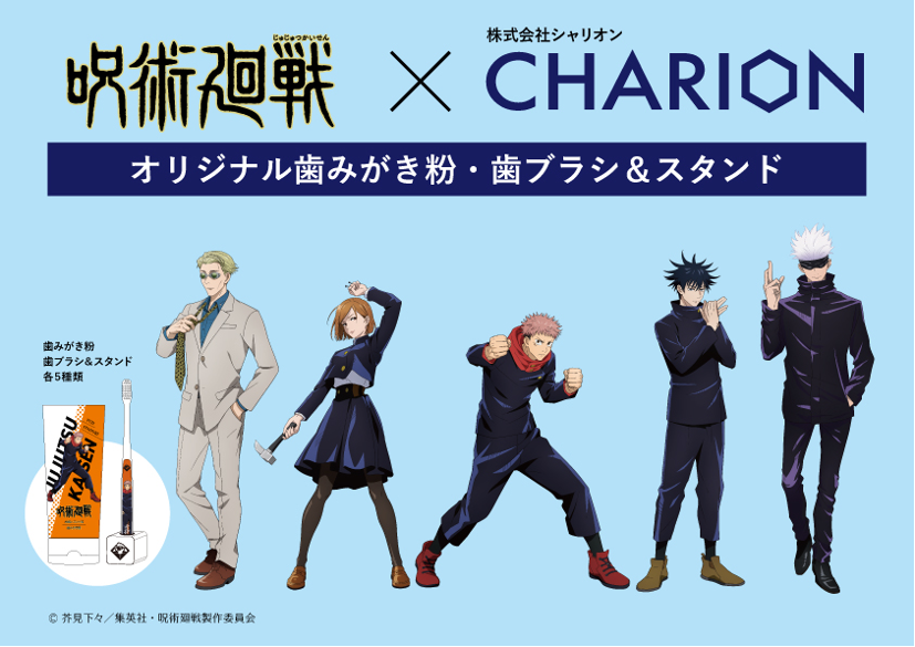 最先端の歯のオーラルケア製品サービスを展開する株式会社シャリオン(本社:東京都港区、代表取締役:角田哲平)は人気TVアニメ『呪術廻戦(じゅじゅつかいせん)』とコラボレーションしたオーラルケア商品を、2021年3月30日(火)から、渋谷ポップアップイベントに出店し発売いたします。また順次、弊社特設サイトや全国の量販店などで販売いたします。